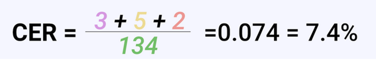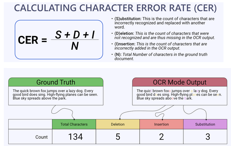 CER calculation is based on the concept of Levenshtein distance, where we count the minimum number of character-level operations required to transform the ground truth text into the OCR output.