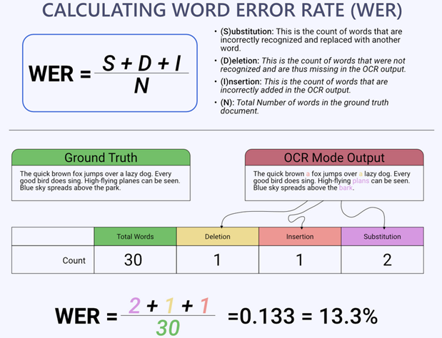 WER evaluates the accuracy of an OCR system at the word level by measuring the proportion of incorrectly recognized words relative to the reference text and is also based on the concept of Levenshtein distance, where we count the minimum number of word-level operations required to transform the ground truth text into the OCR output.